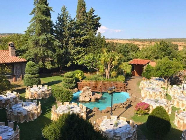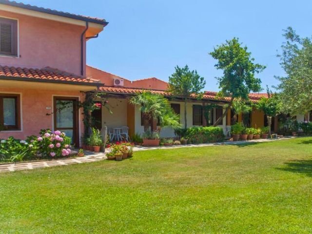 La struttura si estende su una proprietà di circa 20.000 metri quadrati, con un ampio giardino, comode aree di parcheggio e diversi spazi dedicati al relax e al tempo libero. Al centro del giardino si trova una piscina, ideale per rinfrescarsi durante le calde giornate estive.