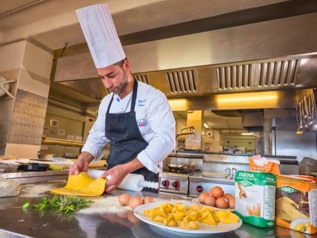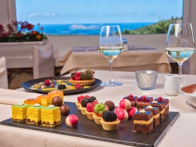 Il ristorante principale si trova su una terrazza panoramica con vista sulle isole di Soffi e Mortorio. Qui vengono serviti la colazione e, la sera, piatti della cucina mediterranea con richiami alla tradizione locale.
